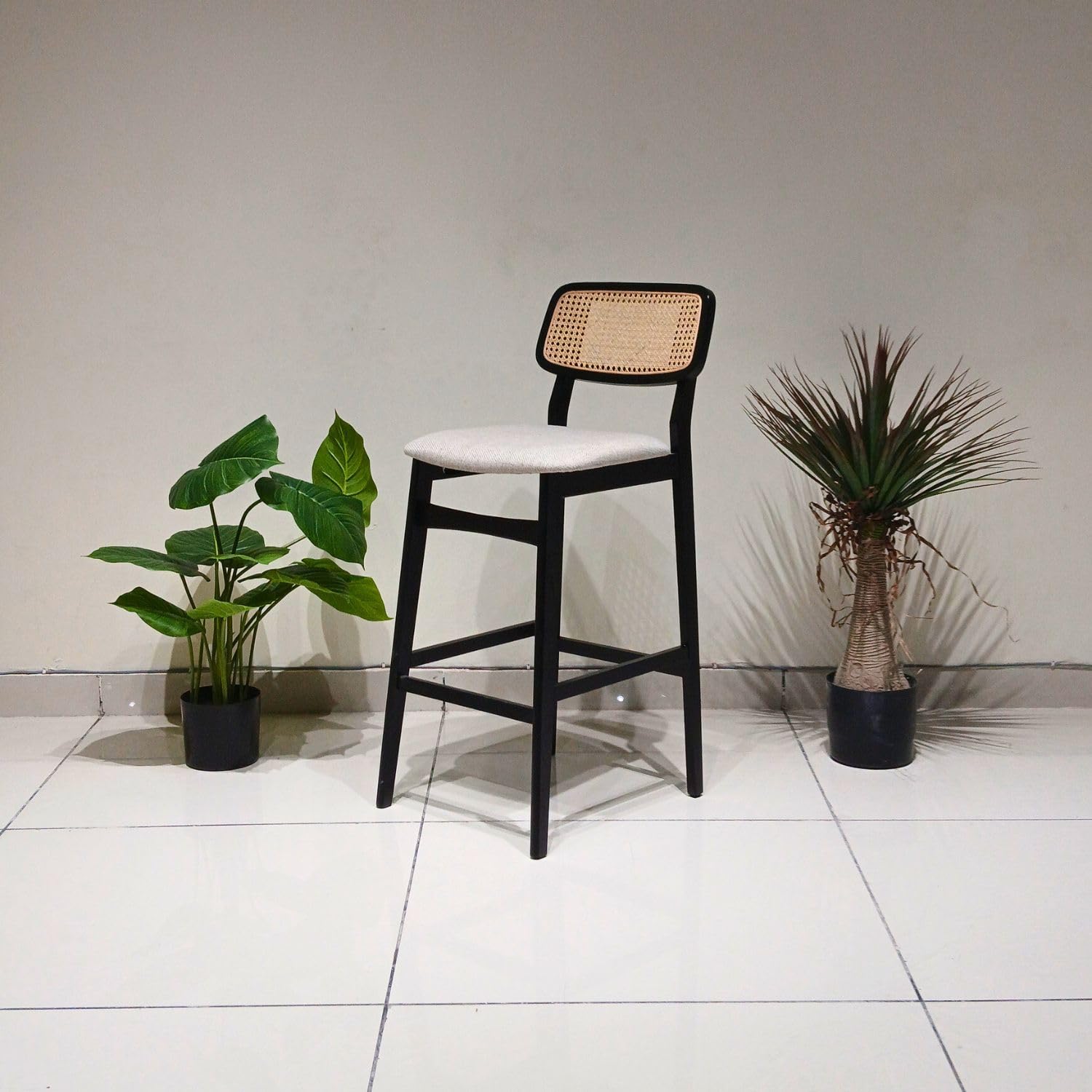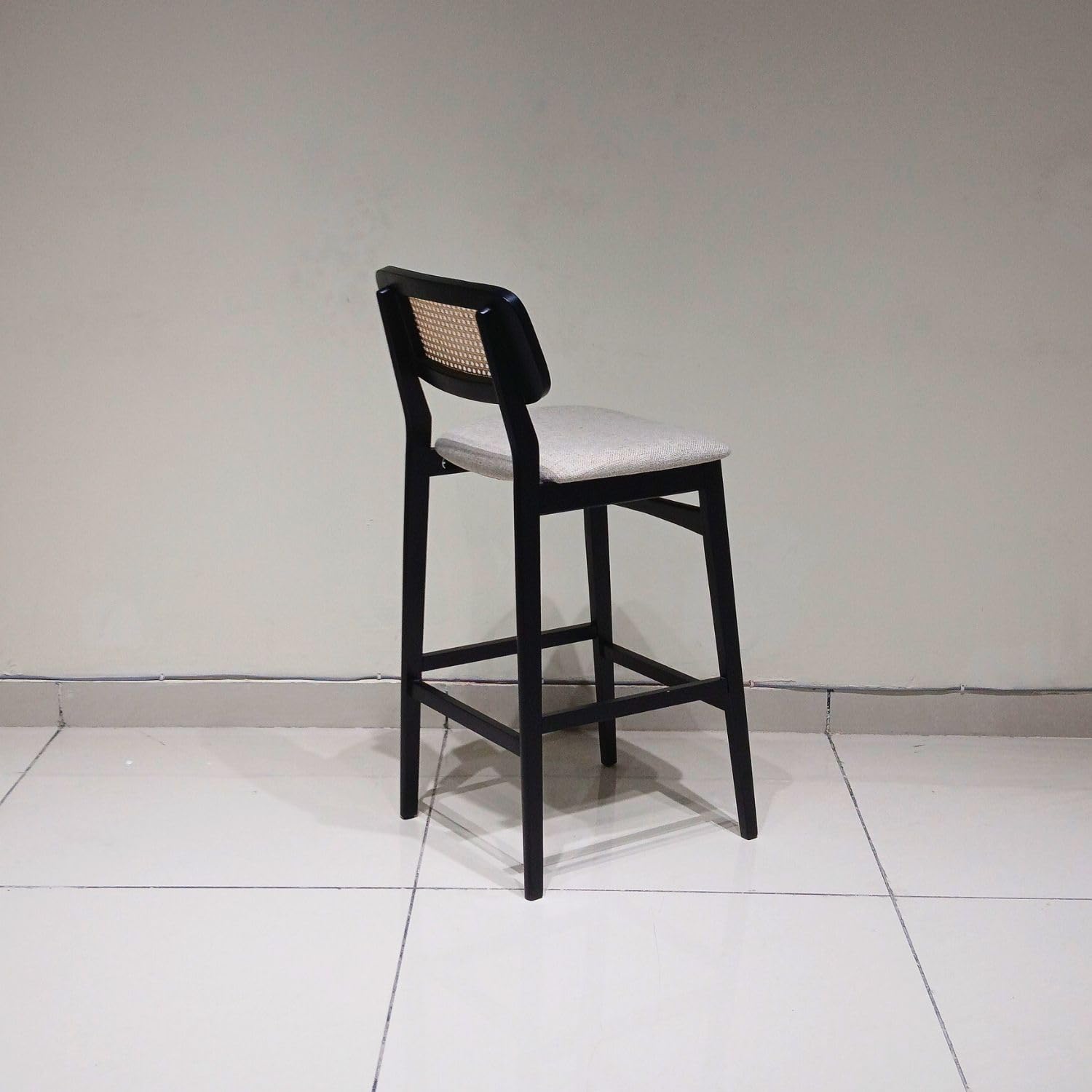 Upgrade your bar or kitchen counter seating with this stylish wooden bar stool, featuring a sleek black frame, a woven cane backrest, and a plush cushioned seat in an off-white fabric. The combination of traditional cane craftsmanship and modern minimal design makes it versatile for contemporary, rustic, and bohemian interiors. A built-in footrest ensures comfort, making it both practical and elegant.