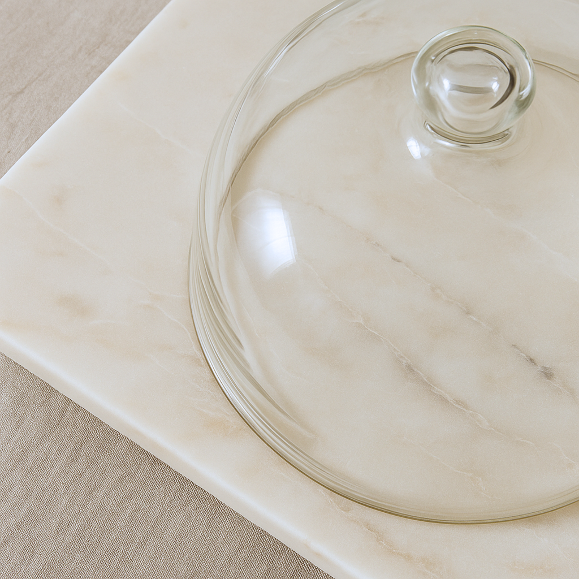 Showcase and serve in style with the White Marble Serving Platter with Glass Cloche. The smooth marble base provides a luxurious platform, while the clear glass dome keeps your food fresh and beautifully displayed. Ideal for cheese boards, desserts, cakes, fruits, or table centerpieces, this piece adds both functionality and sophistication to your dining experience.