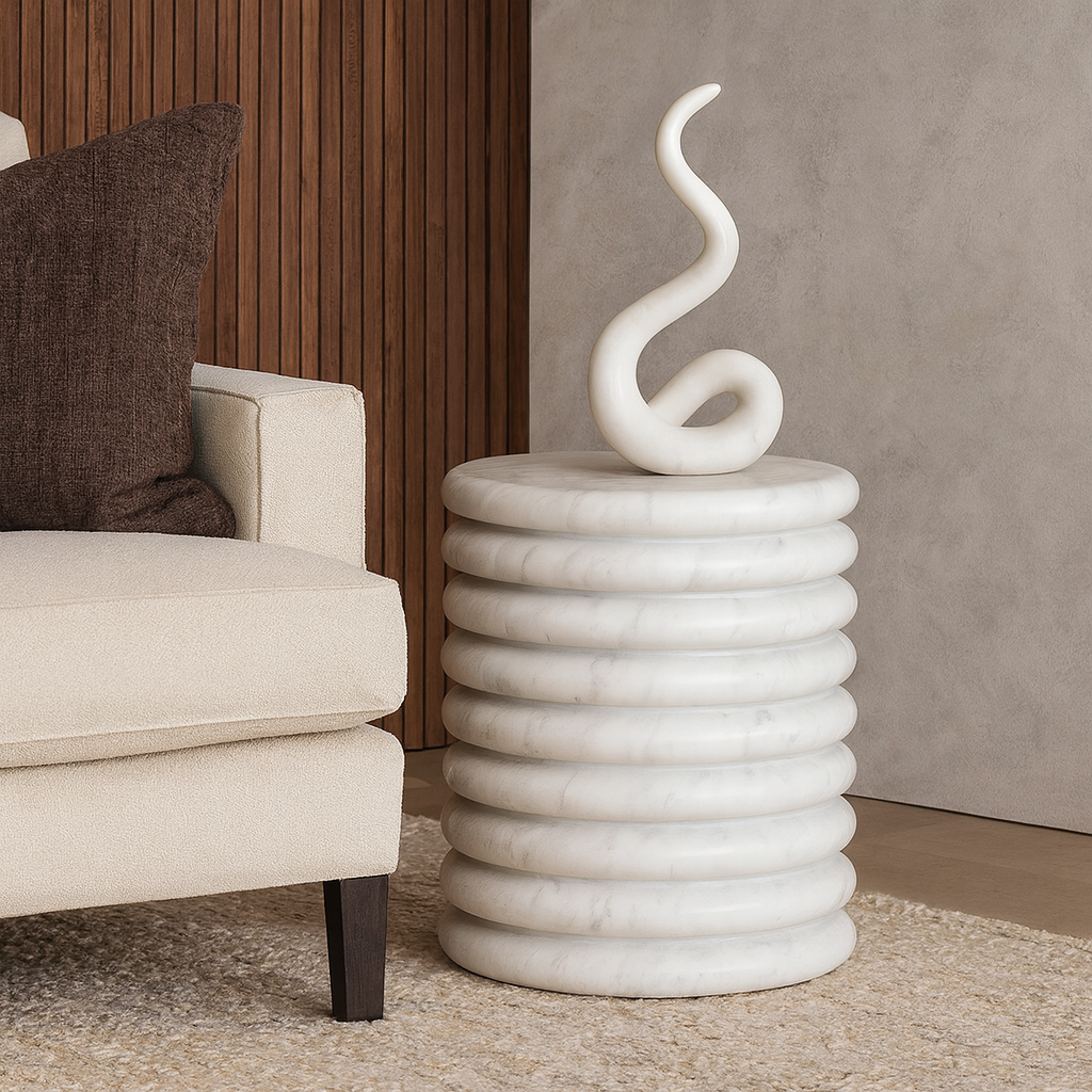 Sculptural yet functional, this White Purple Marble accent table is a perfect blend of artistry and utility. Featuring a stacked, ribbed cylindrical design, it highlights the natural white base with subtle purple-grey veining, making each piece unique.
