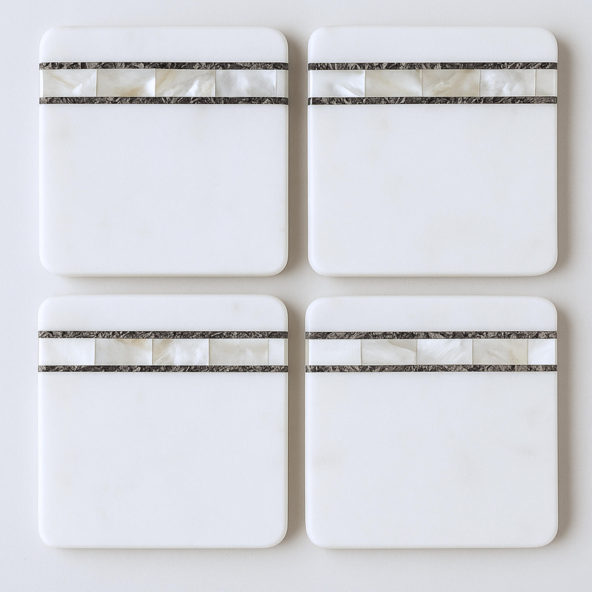 The Linear Inlay Marble Coaster Set blends simplicity with luxury. Crafted from fine white marble, each coaster features a hand-inlaid strip of mother-of-pearl and abalone shell, adding a subtle iridescent sheen. The clean rectangular form and minimalist detailing make it a perfect addition to modern and elegant tabletops.