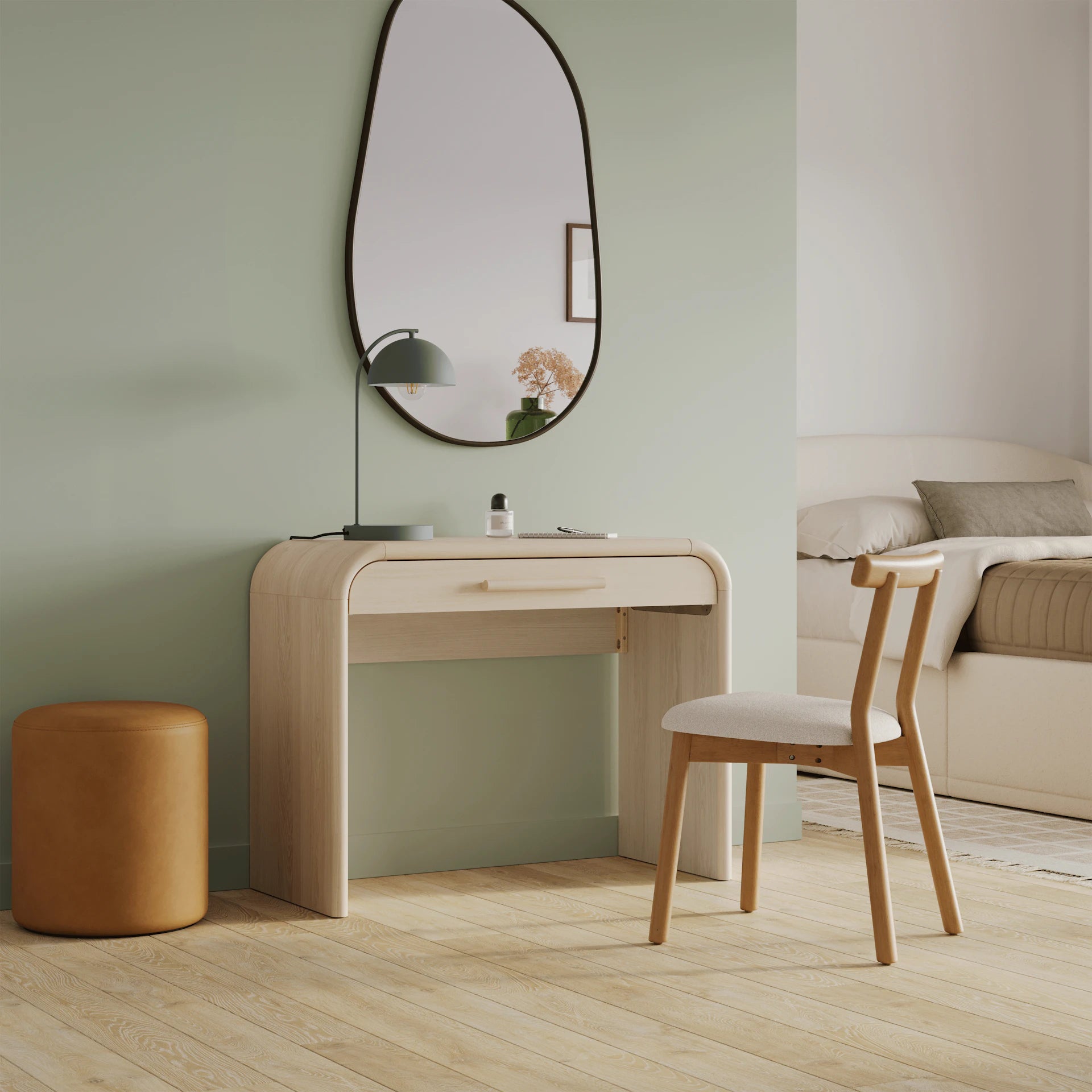 The Sora Desk brings gentle curves and modern form together in perfect harmony. Its softly rounded edges flow seamlessly into sculpted side panels, creating a design that feels both contemporary and inviting. Crafted from solid wood, it features a spacious drawer with a solid wood handle to keep your essentials neatly tucked away, maintaining a clean, clutter-free workspace. Compact yet elegant, the Sora Desk fits beautifully into bedrooms, studios, or small work nooks — perfect for those who appreciate design that’s simple, functional, and beautifully detailed.